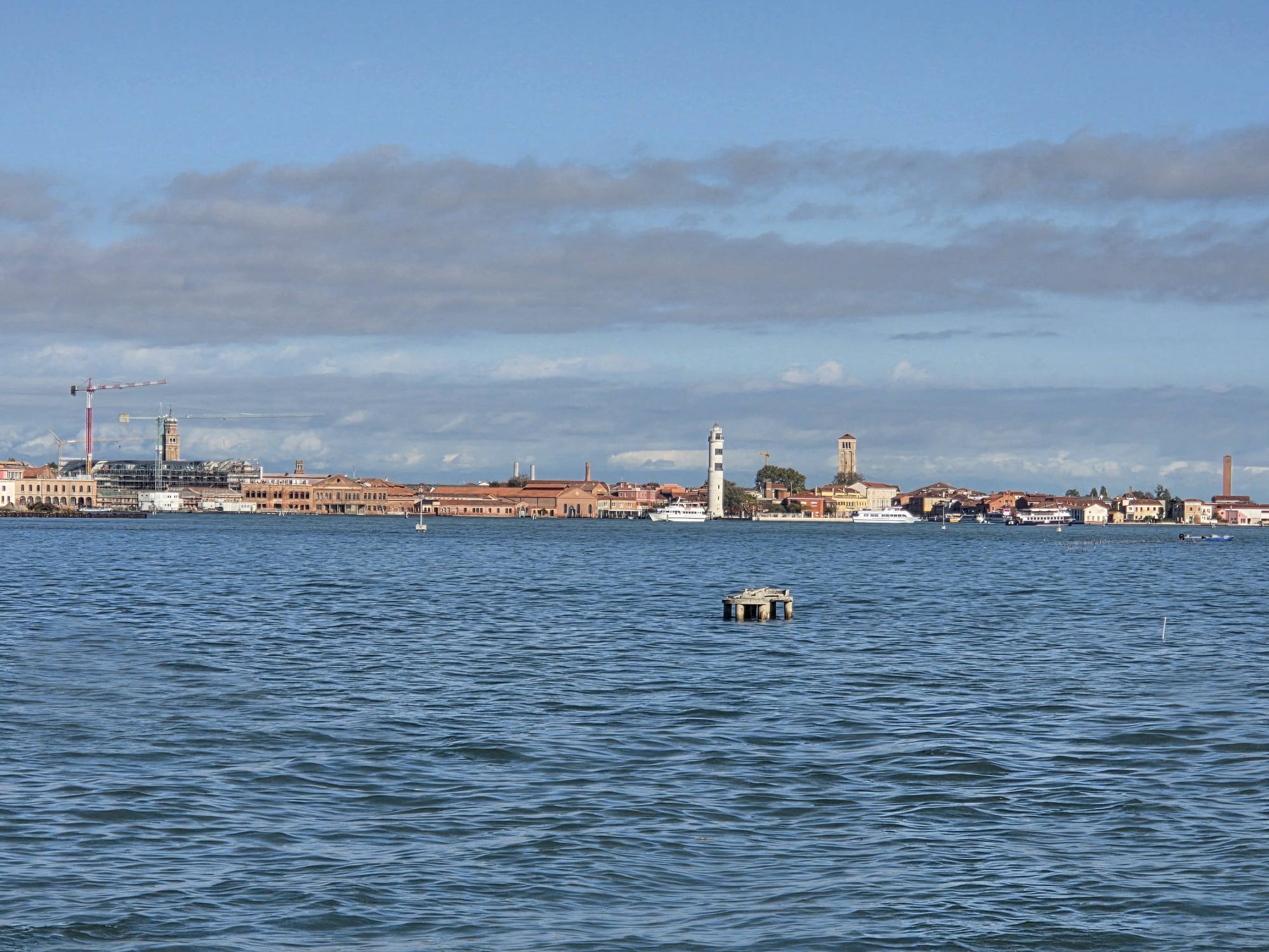 Bottom Row: The metal walkway along the imposing wall of the Arsenale; View of Murano from the walkway.