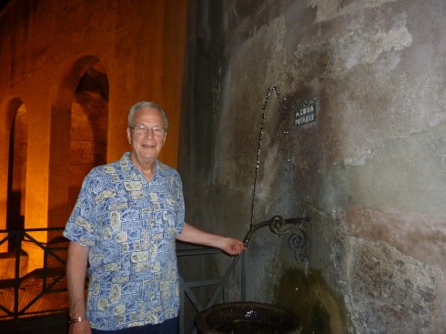 Playing with water: fun for kids of all ages. There are “nasone” and other little drinking fountains like this all over Rome. Ric demonstrates his technique. Block the flow with your finger creating a stream to drink from.