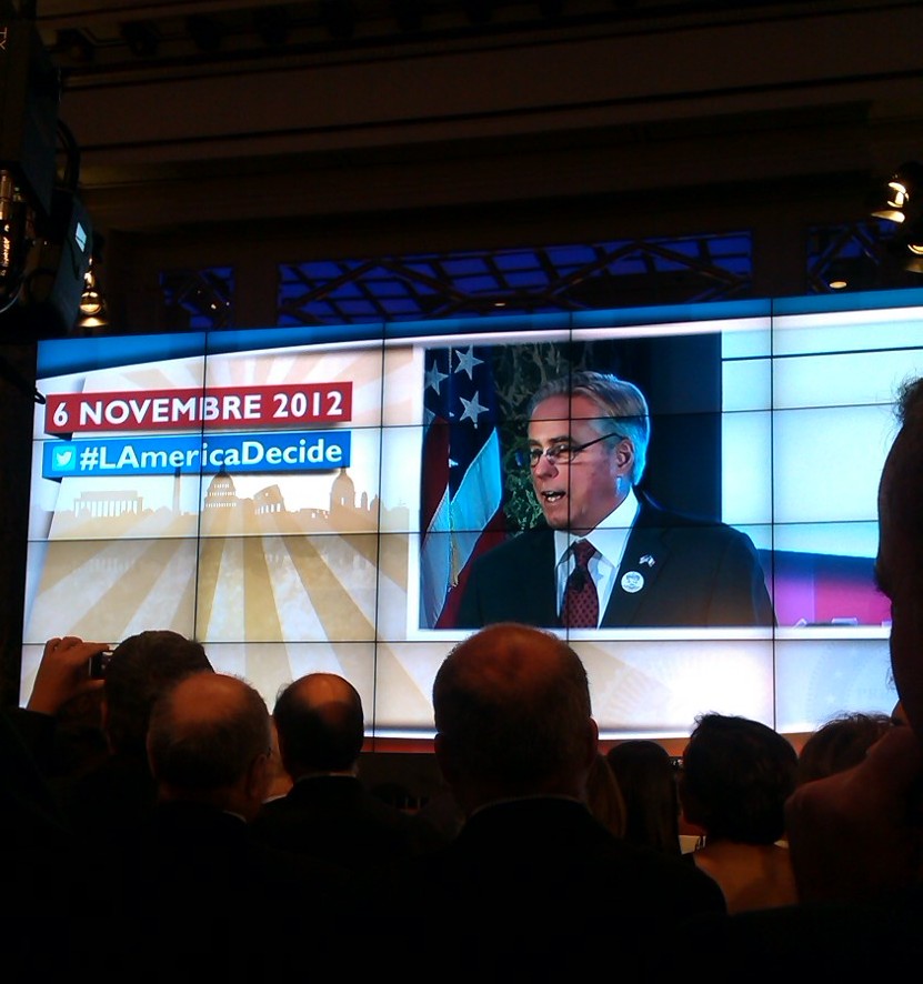 Ambassador Thorne addresses the jubilant crowd. Election results were broadcast throughout the venue.