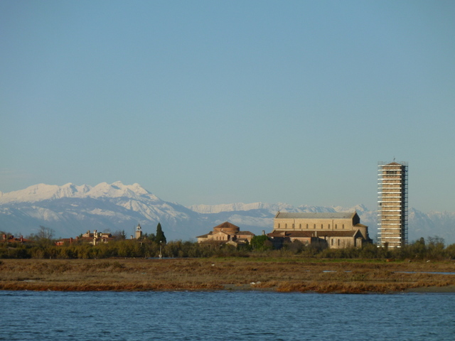 View of Torcello Island and the distant snow-covered mountains. Bellissima!