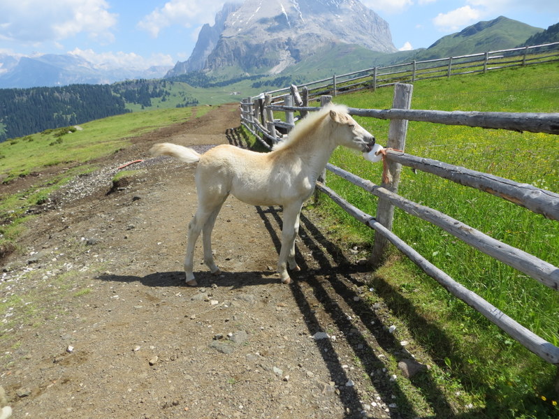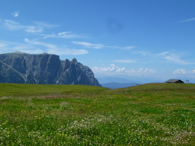 I didn’t really understand the Alpe di Siusi until we had visited. It sits at about 6000-6500 feet with mountain peaks towering over the meadow. The meadow is rolling, with tiny barns, haying operations, herds of cows and horses, crisscrossed with hiking paths for every level of fitness and dotted with wonderful little places called rifugi, refuges where one can take sustenance, quaff a beer, or spend the night. Ric said the word “refuge” brought to mind a rustic lean-to to shelter to use in case of inclement weather. Far from his description, in a rifigio you can find food to rival a café in a major city.