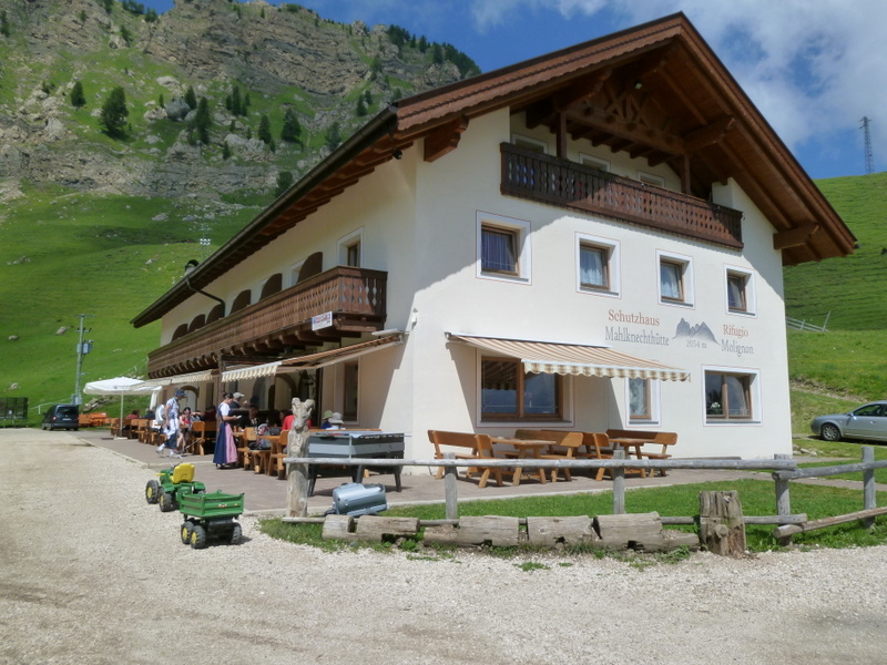 Monday we took the first bus out of Saltria, connected to a chairlift at Panorama, and set out on a four hour excursion, a loop that had us walking to a point where we could make our descent to the hotel at the end. This up-and-down hike allowed a stop for second-breakfast at cute Rifugio Molignon, serving apple strudel and great coffee. We marched on through alpine splendor, ending at another rifugio for lunch before taking a final chairlift down. For those seeking this particular journey, and for the record so I can look back at this blog and remember, after ascending to Panorama, we hiked to Rifugio Molignon, and then on to Rifugio Zallinger, ending at the Florian lift, using trails 2 & 7. It’s briefly described in Rick Steves’ guide where he calls the hike “moderately strenuous.” We’d agree!