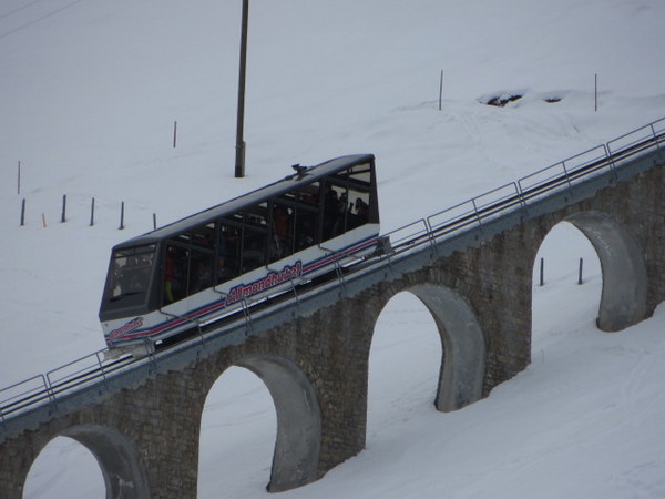 Yet another mode of transportation awaited us, the funicular at Allmendhubel. A quick three minute trip took us to the starting point of a downhill hike back to Mürren. The big difference this time is we shared a mixed-use trail with skiers and “sledgers” as translated into English, the people using the “bob run.” It was a little disquieting to have tiny children as well as adults flying by us on skies and on sleds for what must easily have been a 6 km downhill run. Once again, everyone behaved beautifully and watched where they were going. I doubt we’d have as much luck in the U.S. on such a run as evidenced by my friend Heather who was run down by a sled a few days ago in Oregon. Grazie a Dio she wasn’t injured. Here, if someone ran you down, you might go flying off a cliff!