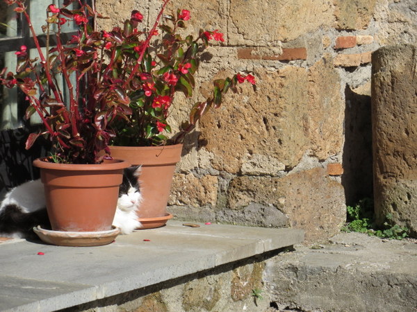 Kitty enjoys the sun in her garden. Lots of black and white cats indicating a shallow gene pool.