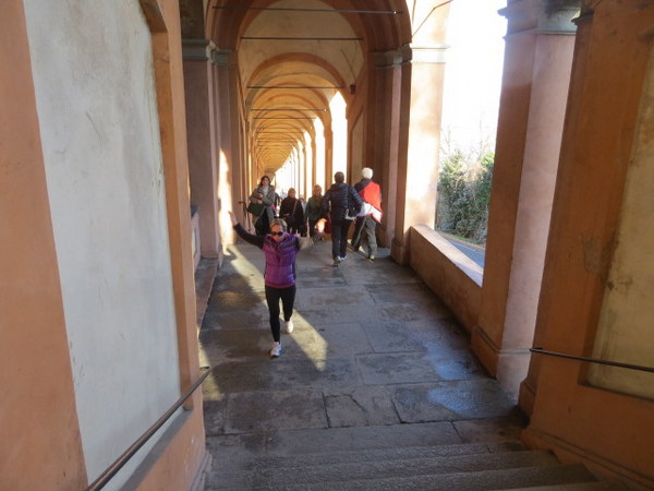 We had lovely weather, so rather than spend time indoors, we took a phenomenal urban trek, the Percorso della Madonna di San Luca. This is a walk of about 4 km (2.4 miles), 2.3 km of which is steadily uphill. The walk is entirely covered by the famous porticos of Bologna, and is the longest continuous section of portico-covered walkway in the world. There are 666 arches. In that final 2.3 km, the altitude gain is a respectable 722 feet (220m), a workout indeed! We were impressed by the number of people doing the percorso on a cold but sunny Sunday. Afterwards we of course rewarded ourselves with a fine tagliere and wine, accompanied by a salad for the health of it.