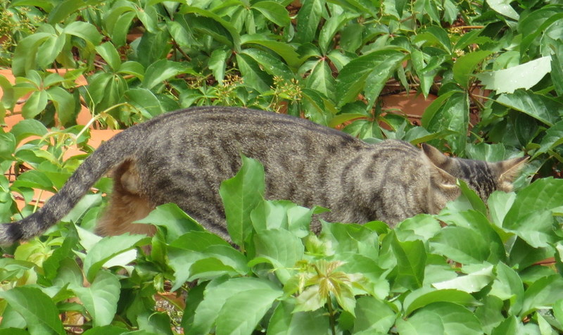 Kitty hiding in the plants growing in a high garden as we walk the walls.