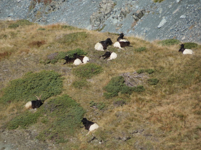 Black & white goats, unique to the Valais, resting in a high mountain pasture.