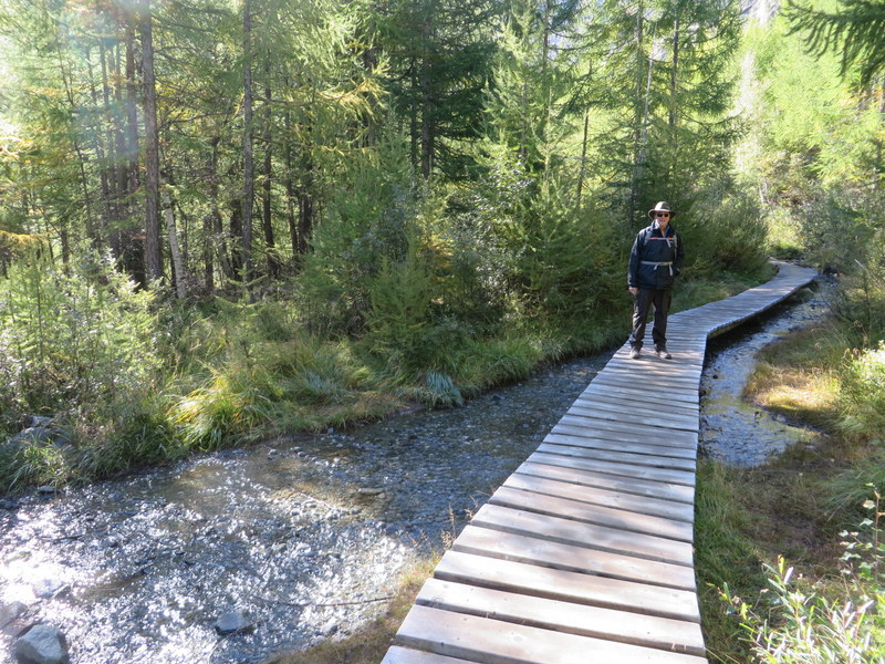 Wooden path across stream and bog, Furi.