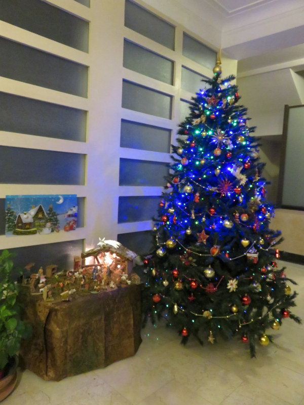 Tree and nativity in the lobby of our building. Traditionally the portiere puts up a tree.