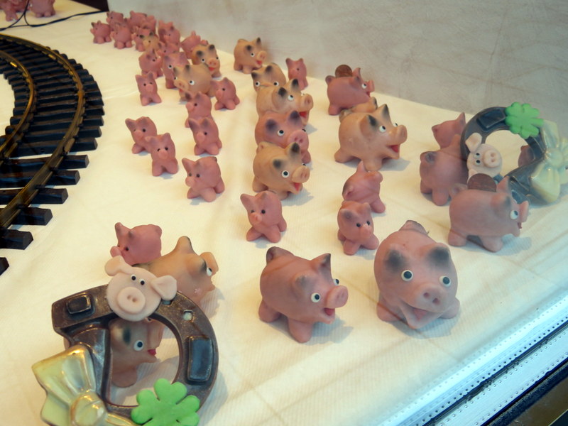 In German culture, Marzipan pigs are given at New Year’s for good luck. These are displayed in a shop in Chur.