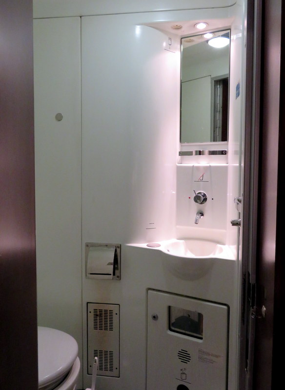 Our tiny but so-convenient bathroom on the train. We could not coax hot water out of the shower, but the in-compartment toilet is mighty nice at 1:00 AM.