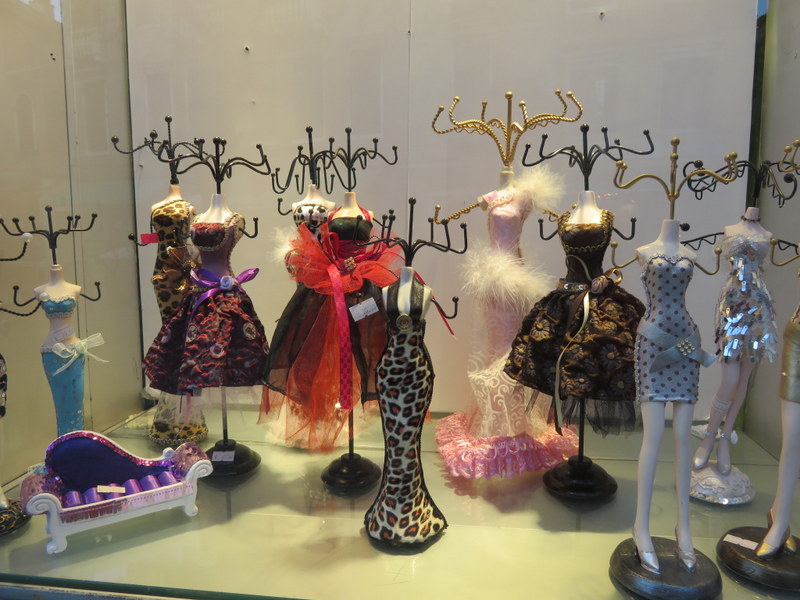 Cute window display of jewelry trees.