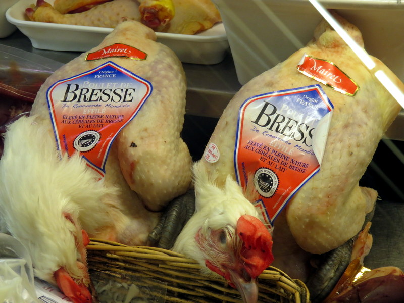 A Bresse chicken is the most expensive chicken in the world, so we are told. It has appellation d’origine contrôlée status,. We did not eat any. Retail price, uncooked, about $25/pound.