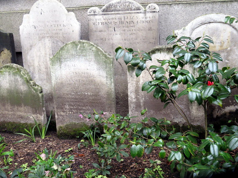 Tombstones in Postman’s Park, London, a park which grew out of a former burial ground. It includes a Memorial to Heroic Self Sacrifice as well.