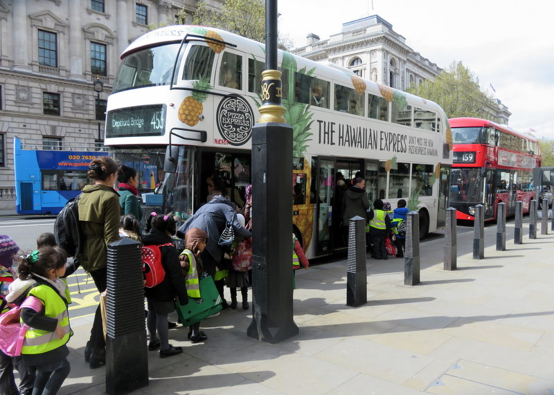 I don;t know whay is cuter here: The little children on a school outing in their safety vests or the double-decker bus painted to promote Hawaiian pizza (which is a travesty in Italy).