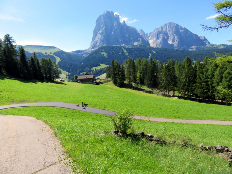 A woman walks her two dogs up the trail, high above Santa Cristina.