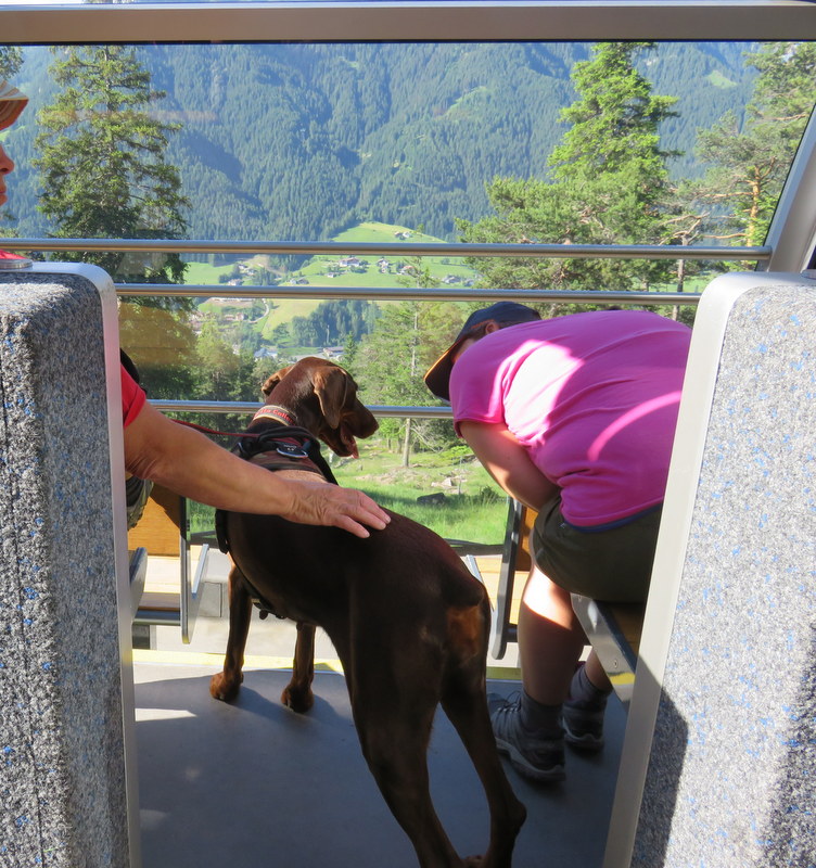 We see many dogs on trails and in lifts. This one is riding a funicular.
