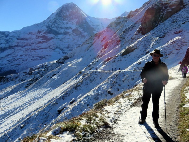 The sun defines the undulating trail from Männlichen to Kleine Scheidegg.