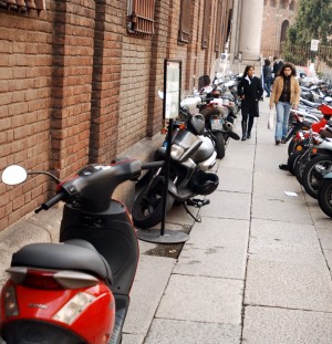 Not unusual to see the sidewalk as a parking lot for motorini, and frequently one or more are in motion.