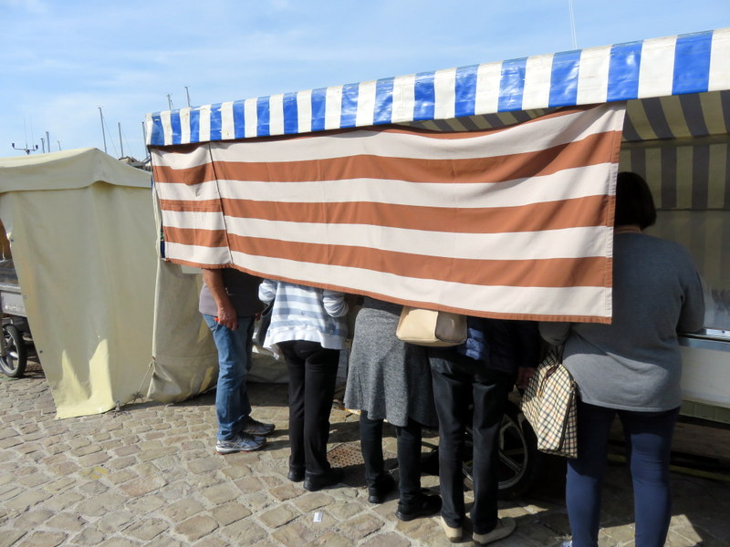 These people are buying fish. I was amused at teh view. The awning is down because the kiosk faces the morning sun. Wouldn’t you think they’d orient the kiosk the other way?
