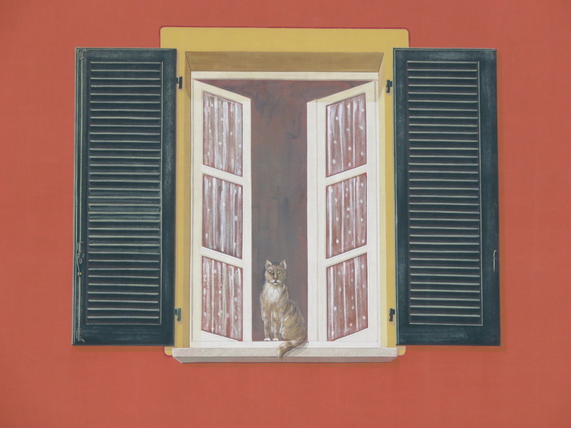 Kitty has a view…of trains. Tromp l’oeil in Bra.