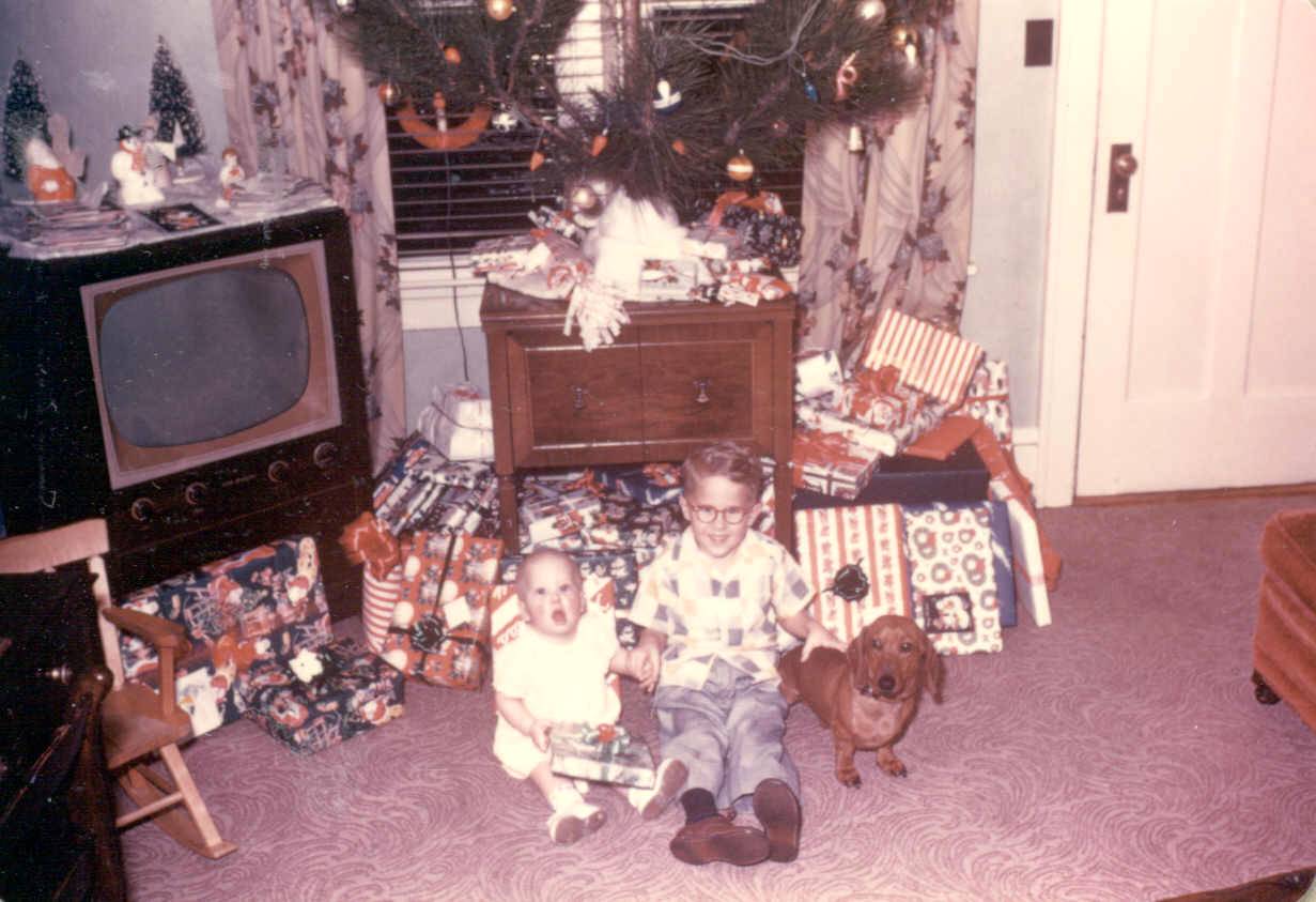 My first Christmas, 1953, pictured with my big brother, Rick, and our dachshund, Peter.