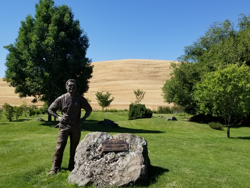 Memorial to winemaker Devin Corkrum Derby with wheat fields in the background. Almost 900 acres of the 1000 acre ranch are still planted in wheat.