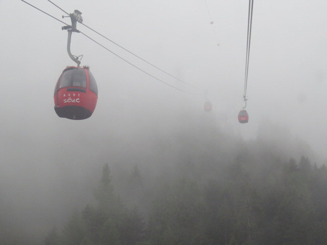 The red cable cars emerge from the fog as we ascend to the Alpe di Siusi. We decided to go on a foggy day and found tranquility but no rain.