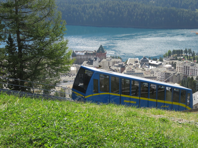 The funicular arrives at Chantarella above St. Moritz. Lots of cyclists surging down mountain trails.