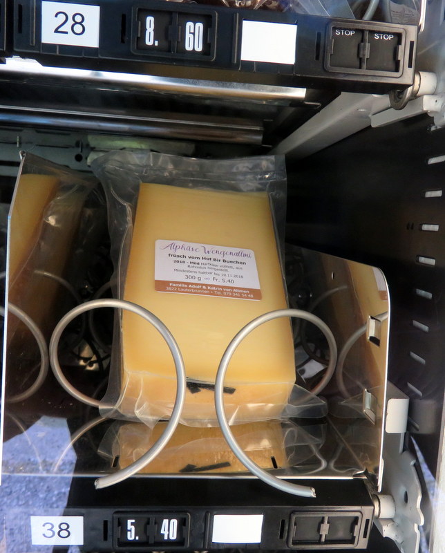 Along a trail in the Lauterbrunnen Valley, a vending machine for farm cheese, sausage, and wine. I kid you not!