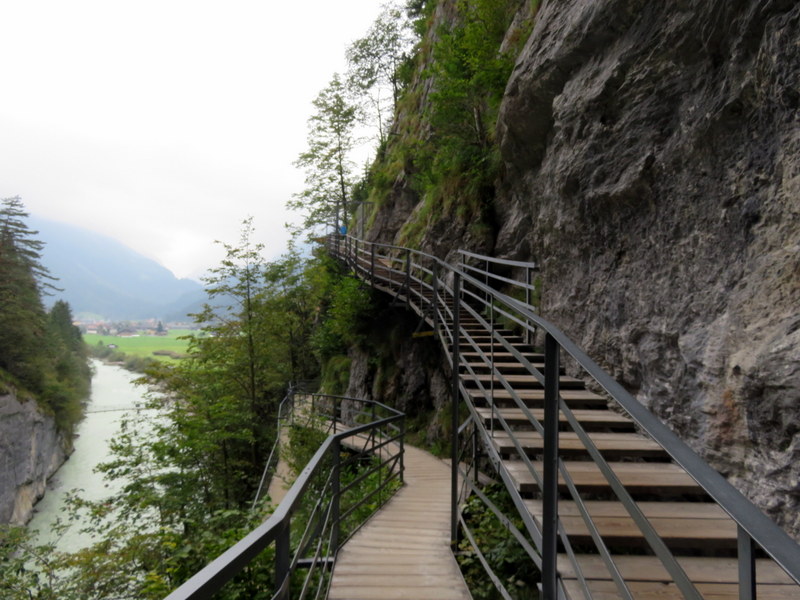 A new-to-us walk was through the Aare Gorge on a slightly overcast day. We exited our train at teh same leve as teh river, climbed up to the gated entry where the walkway began.