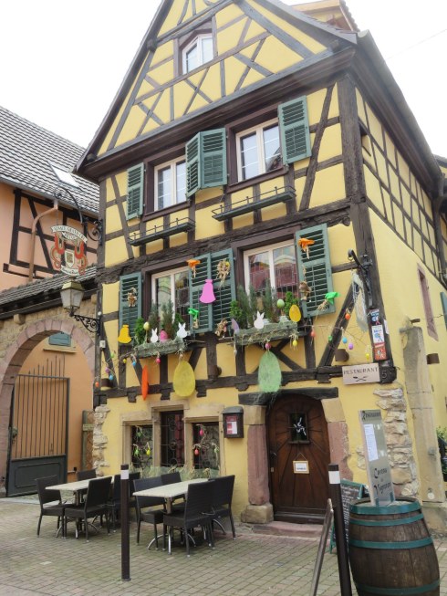 One of the more brightly colored buildings, this one in tiny Riquewihr. Can you see the bunnies in the window boxes?