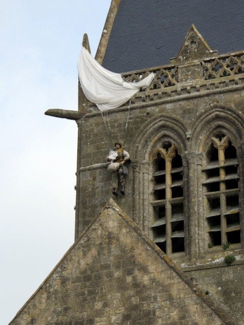 If you have seen “The Longest Day” you know the scene where the parachutist gets caught on the clock tower of the church at Sainte-Mère-Église. True story, kitchily depicted today.