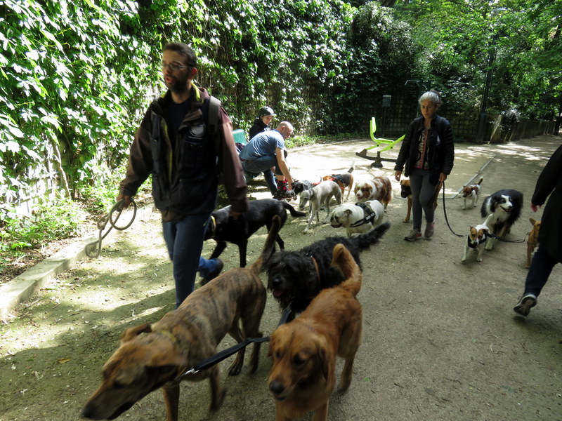 These walkers had about 15 dogs between them. Some unleashed, many triple leashed. 15 dogs at 15 Euro per dog maybe 225 Euro for an hour?