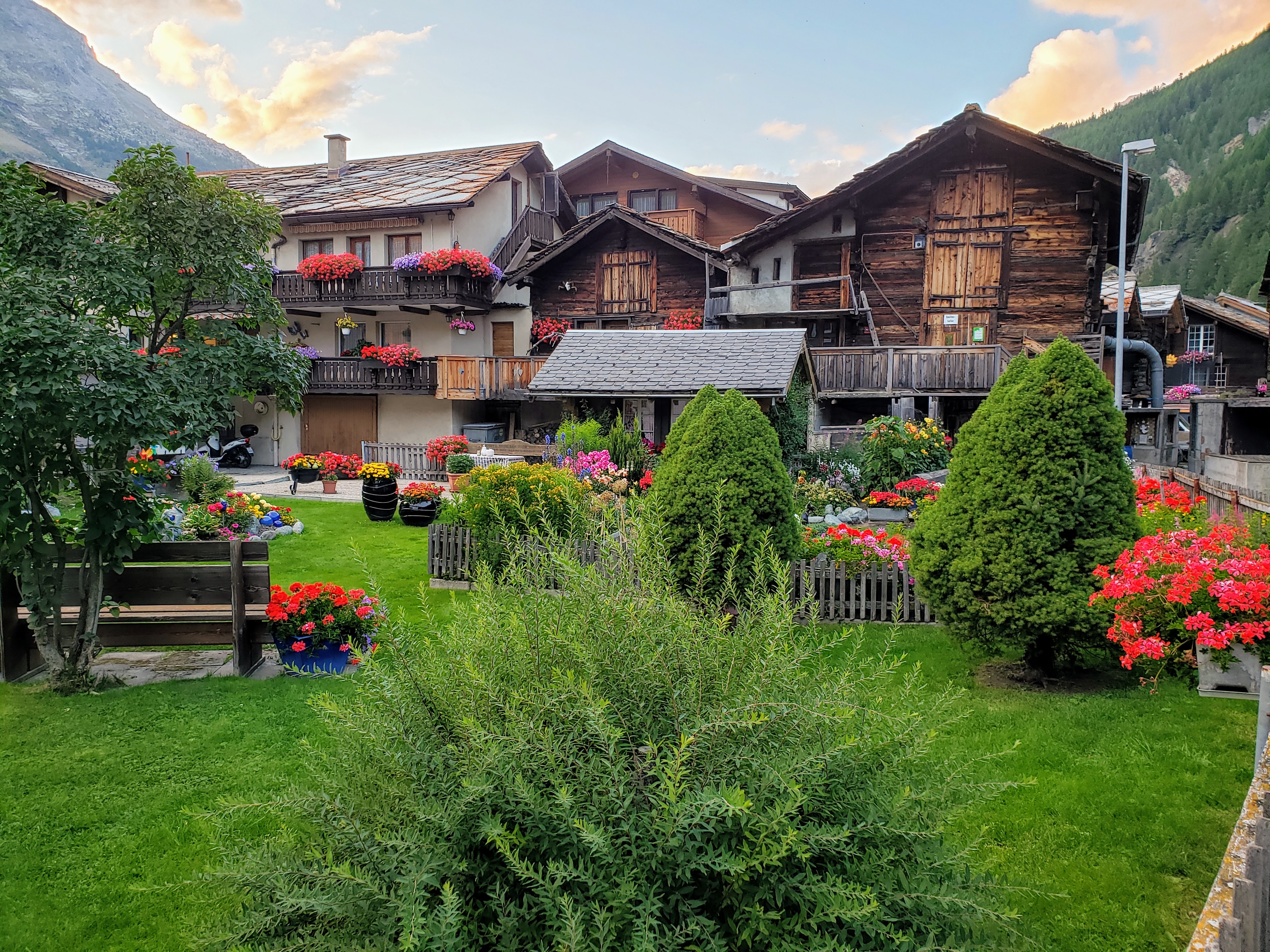 We start, however, in the Saas Valley of Switzerland, a new-to-us and lesser-known area one valley over from Zermatt and the Matterhorn. Below, a few pictures from our first evening in Saas-Grund. We have never been in Switzerland this early in the summer. We usually arrive in mid-September. Thus the late summer gardens are flourishing (no drought here) and the evenings are milder. Outdoor dining is pleasant.