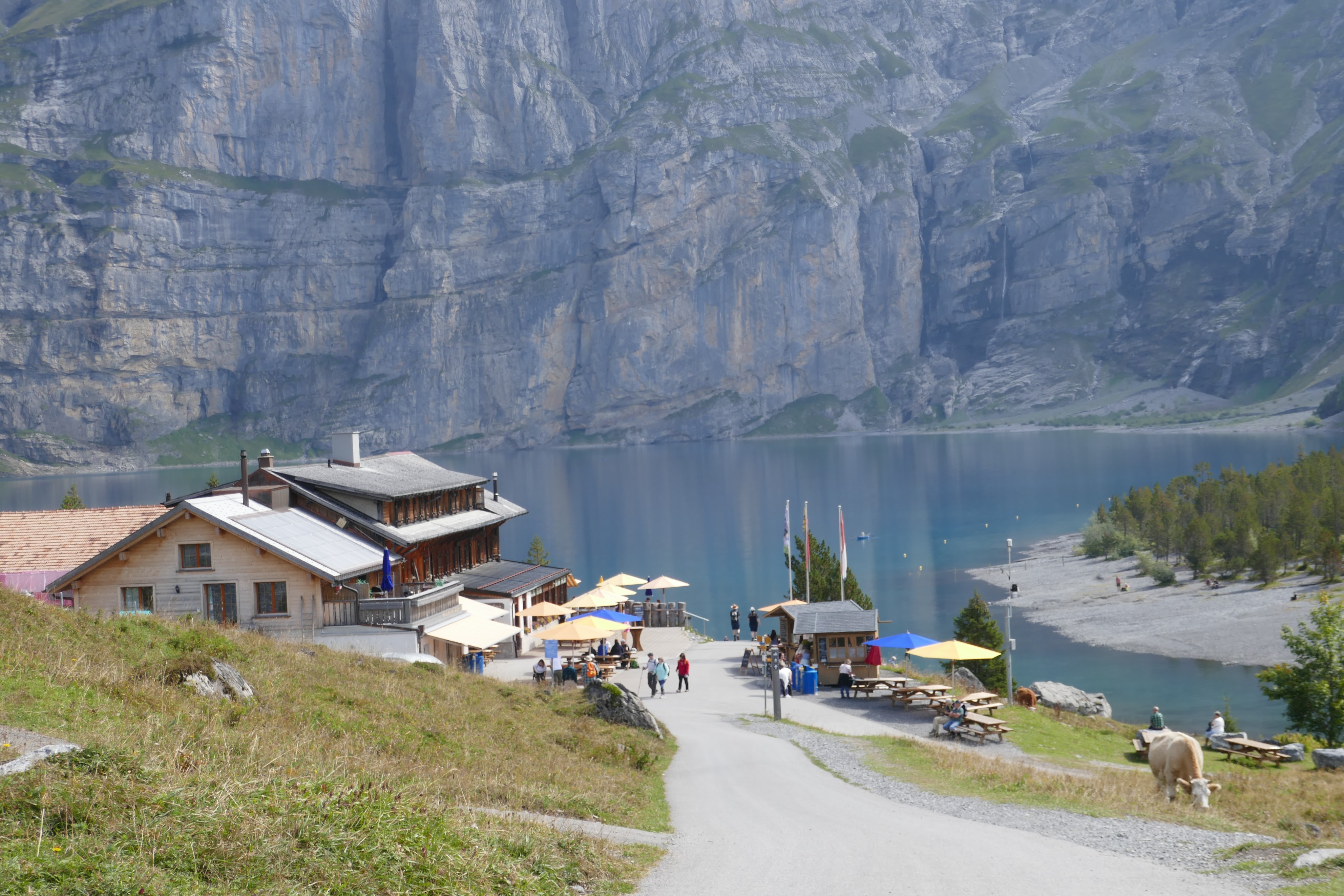 Oeschinensee with requisite lakeside restaurant, a rocky beach, sheer cliffs on the far side, and cows, of course.