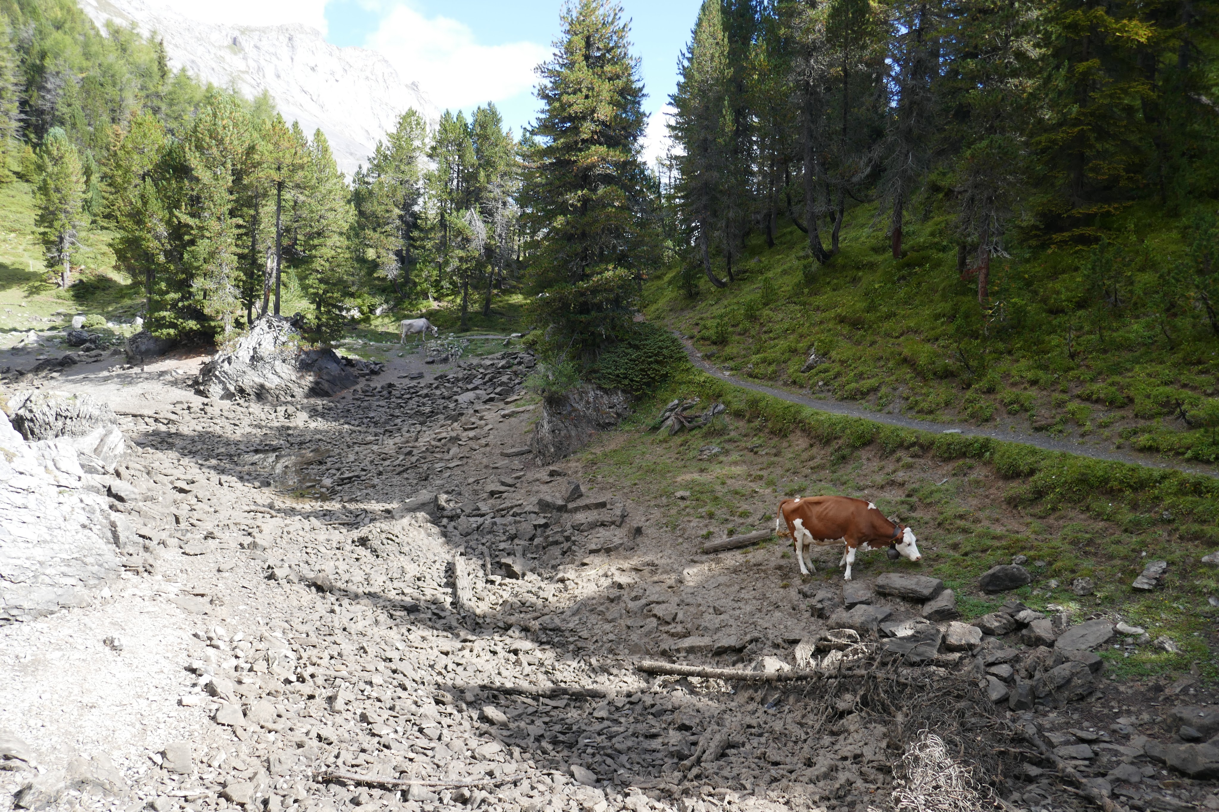 Below, scenes from the Sunnbüel area, the Arvenseeli Loop. Note the cow standing in a dry, rocky lakebed.