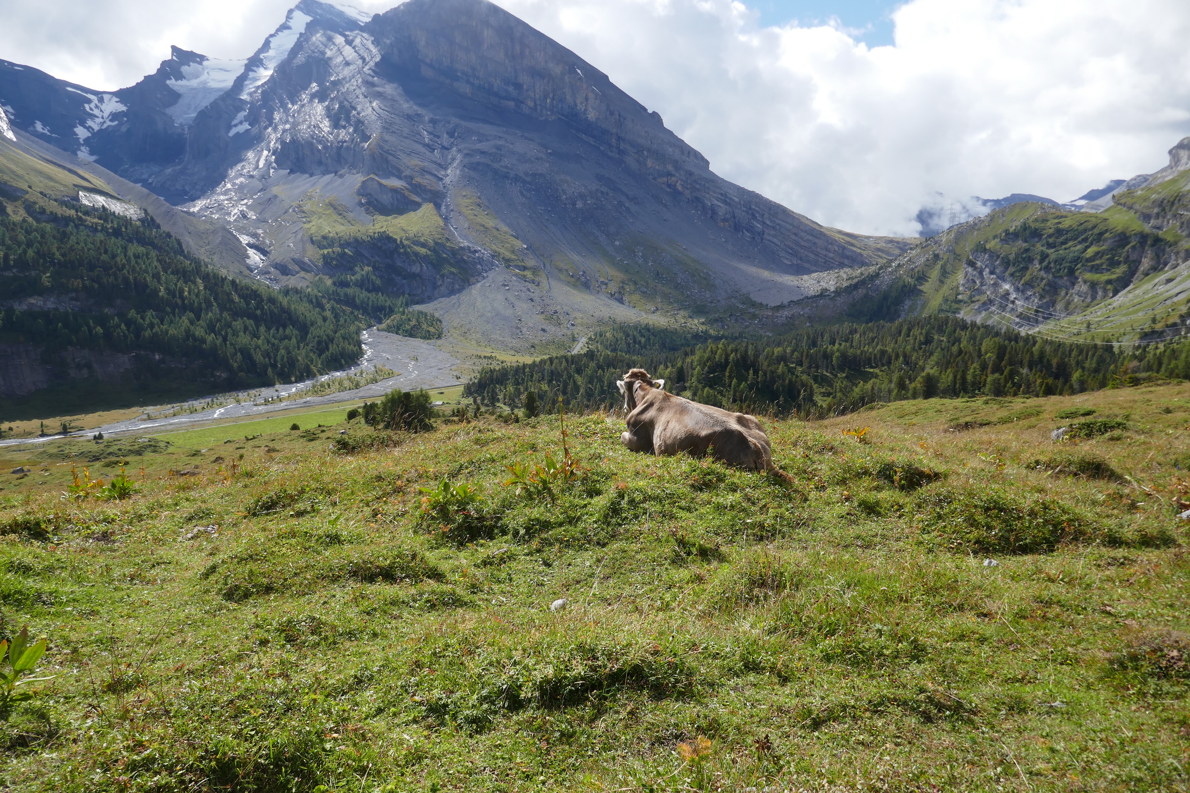 It is clearly cow parade season as a herd of about 15 sauntered past our terrace on Saturday, stopping all traffic through Kandersteg on a fine sunny morning. An hour later, while taking the bus to the end of the valley to start our hike for the day, the bus had to stop for three dozen cows to pass. This was not the driver’s first parade. She immediately exited the bus and shooed the cows away protecting her vehicle!