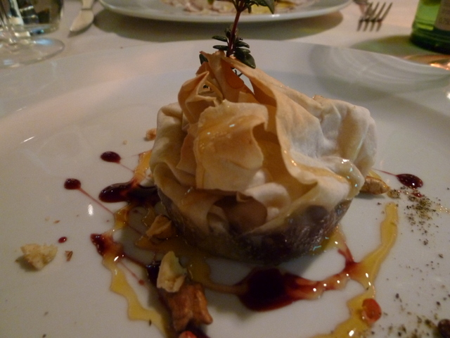 Antipasto of a pear baked with pecorino and a red wine sauce in puff pastry.