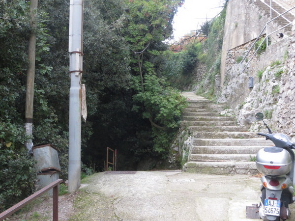 thinking the trail the book depicted had fallen into disuse. (The book said “Where the pavement ends take the dirt path on the left.” It said nothing about the staircase to the right, which was the correct way.) Luckily we decided to ascend said staircase to see where we were and picked up the rightful trail, one with mush easier going. We’ve encountered many un-groomed trails in Italy. This one had parts that were almost too good to be true! Contrary to the ruggedness of the Cinque Terre, parts of this trail were stone embedded in concrete with retaining walls. But oh-my-God there were stairs!