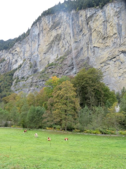 This is the view from “our” apartment in Lauterbrunnen: Staubach Falls and a small herd of cows as well.