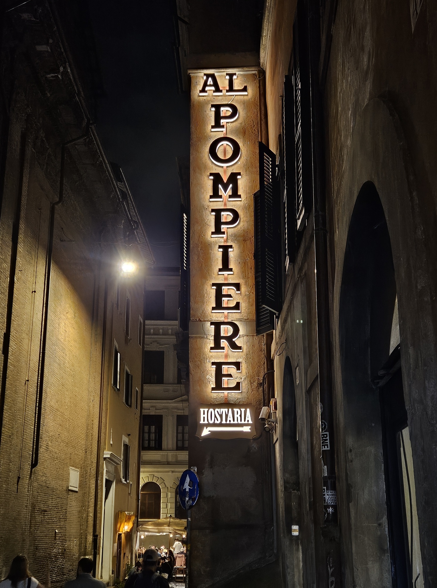 Our final dinner of the trip was at Al Pompiere, well known yet for all the years we lived in Rome we had not visited. It was our loss! Family owned and operated, the padrone waited on us in the tradition of old hosterie (osterias). Classic Roman food: puntarelle (a salad of chicory sprouts with anchovy vinaigrette), carciofi alla giudia (fried artichokes), fiori di zucca (fried zucchini flowers stuffed with cheese and anchovy, battered, and fried) and much much more.