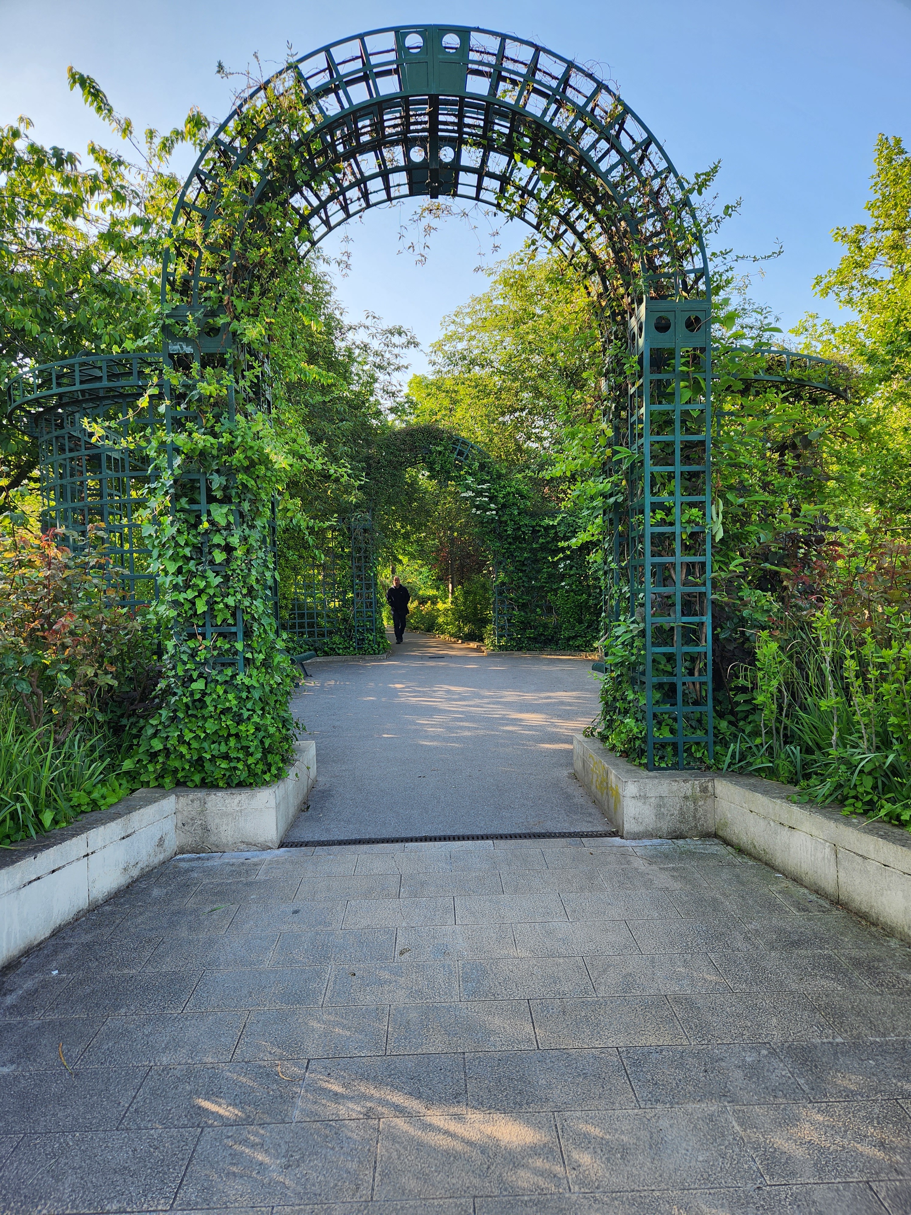 Getting here was a two-day journey. We avoid flying when we can and so we did. Tuesday we rode on two British trains to London, then the EuroStar to Paris, where we spent one night. The next day, a French TGV Lyria took us to Basel and was followed by a series of three Swiss trains to get us to our tiny mountain village. I know some would find this nightmarish (my brother’s idea of Hell, I think) but we travel light and find it far less stressful than flying. Plus a night and a morning in Paris = a fine meal and a lovely morning walk in an elevated garden, La Coulée Verte René-Dumont, which I wrote about four years ago in this Postcard from Paris.