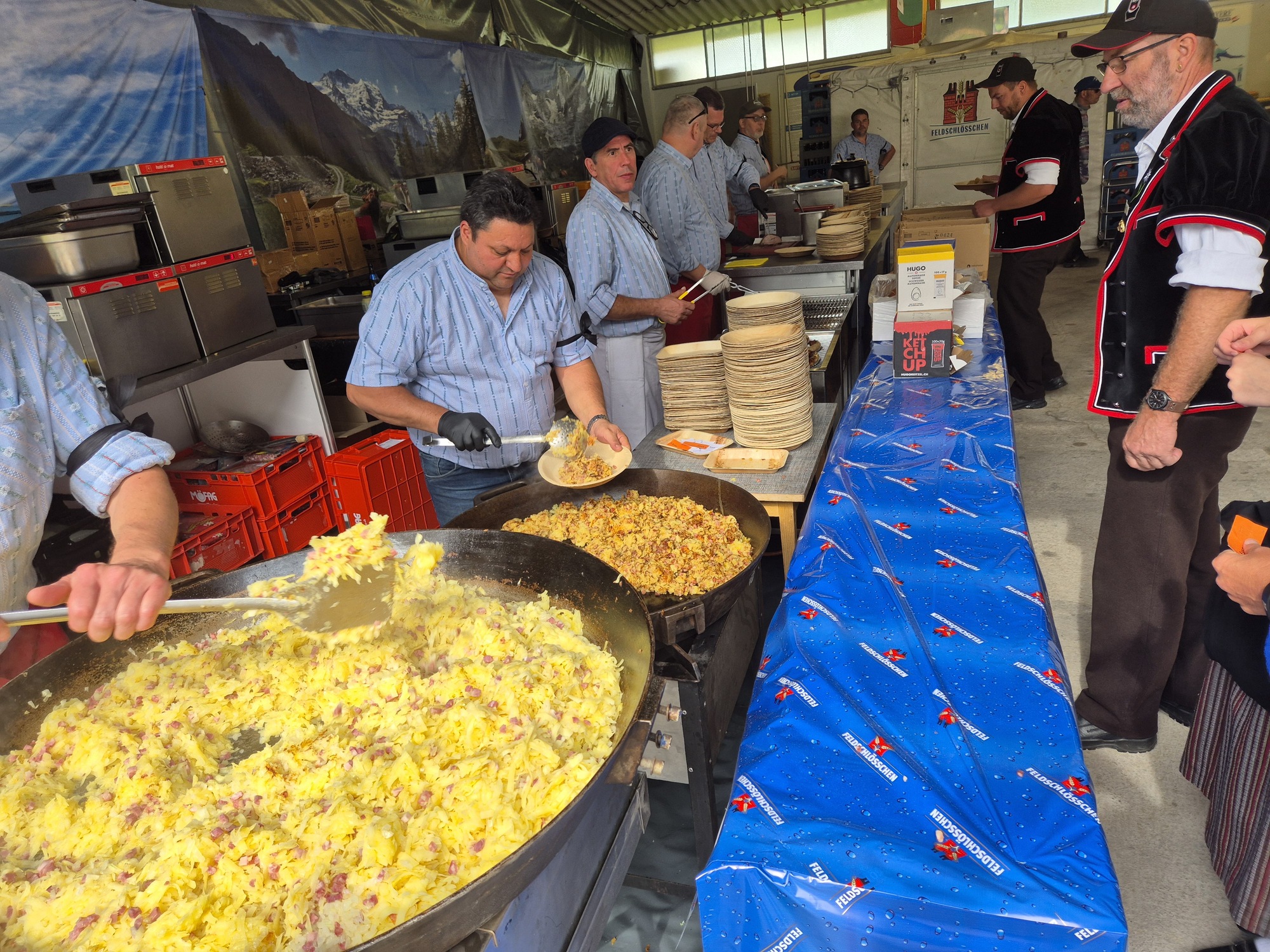 Three and a half kilometers away, as the crow flies (12 km by car, but you cannot drive there) is Wengen, which put on a grand chästeilet Saturday and Sunday a week ago. An evening and a day of celebration with music and massive quantities of food, table space for hundreds of people, gigantic cheeses, and handmade goods for sale. You could arrange to purchase a cow share. (Not sure if that means alive or butchered.) For a community of 1,300 permanent residents, it was an amazing event.