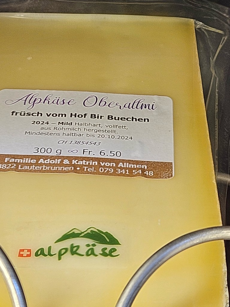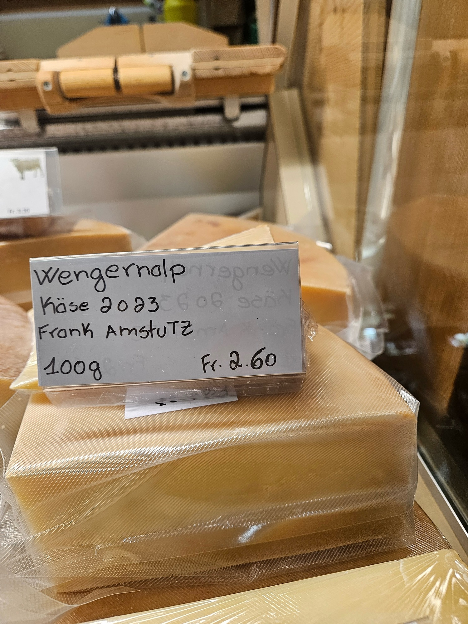 Two cheeses labeled in the grocery store case, one from Stechelberg and another form Wengernalp. The third entry is in a vending machine outside the farm along a road many walk through the valley.