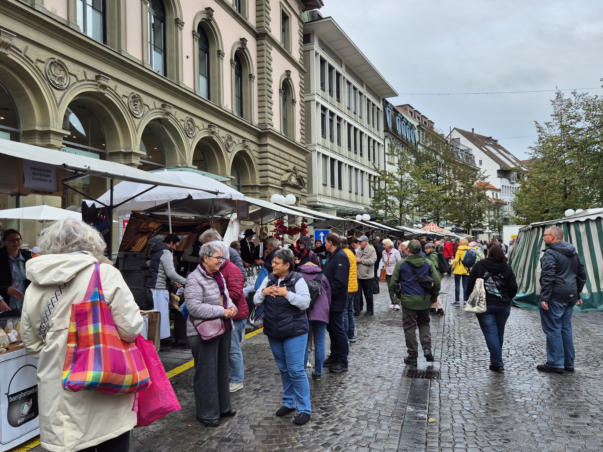 Today we attended the cheese festival in Thun (pronounced ‘tune,’) 42 km away on the shores of Lake Thun. Thun is much larger at 42,000+ people, and draws farmers’ production from all over the Canton of Bern, so the festival is huge. Here they call it käsefest. There must have been 40 vendors as the Thun festival is all about sampling and selling. Cows milk cheese, goats milk cheese (it’s not all feta or chèvre), sheeps milk cheese, organic or not, they had it. Need your fondue or raclette cheese stash fortified for the coming cold months? Buy direct from the farmer at the Thun käsefest. Perhaps chilli pepper laced alp cheese or an herb-flecked mild cheese is more to your liking.