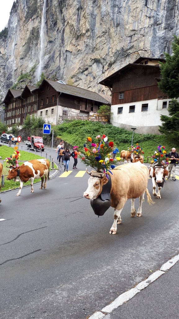 We have seen many “cow parades” over the 10 years we have been coming to the Jungfrau Region as well as some in other parts of the country. Sometimes there are formal festivals with costumes for both cows and humans. Sometimes it is a farmer simply walking down the street with his 5 or 6 cows when he has the notion to descend. When we hear the giant bells clanging, we run to the street or window (along with many others) to watch the ancient tradition.