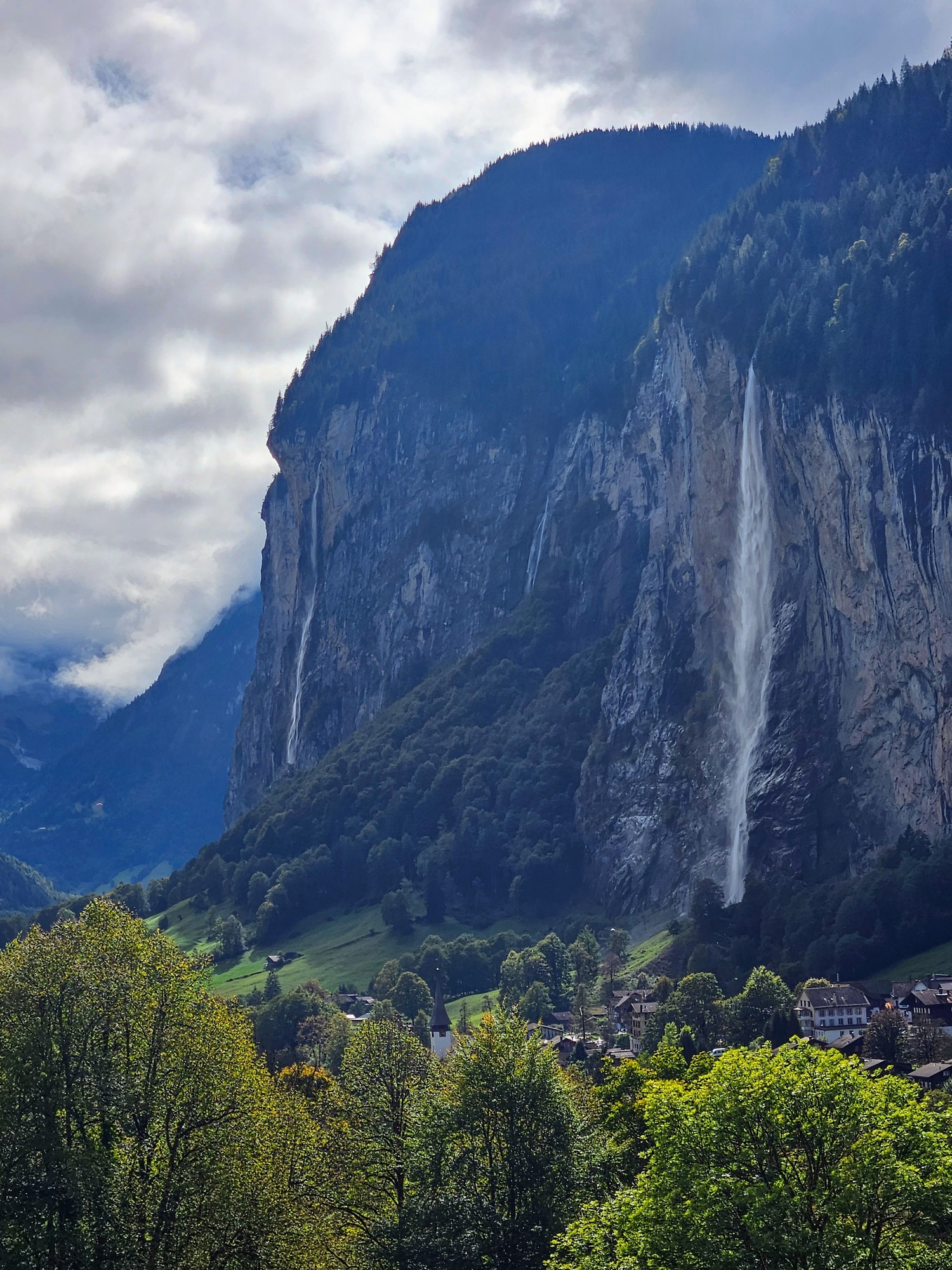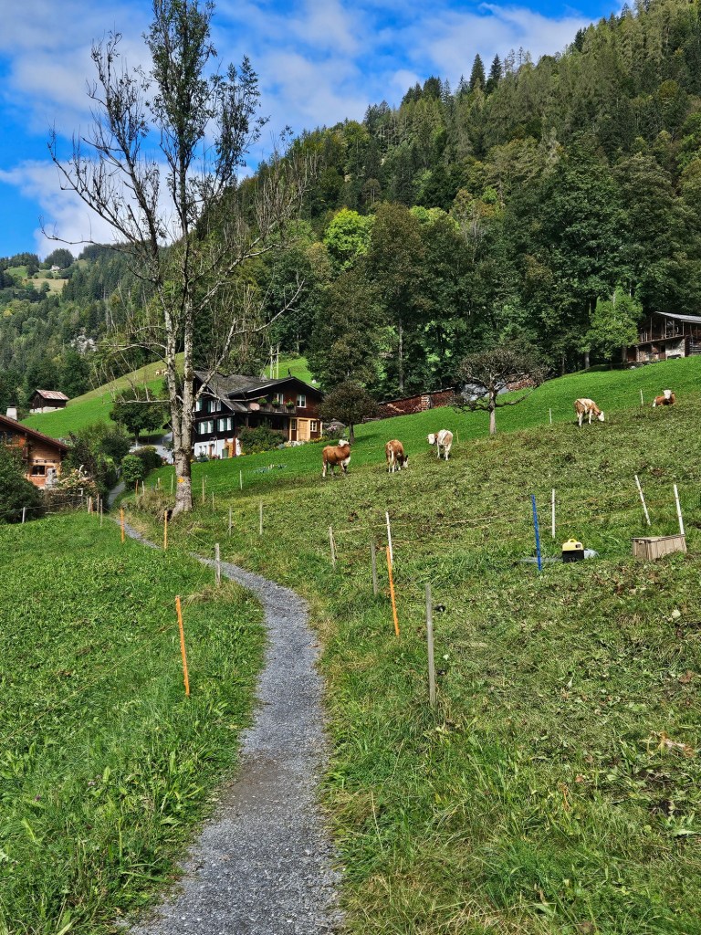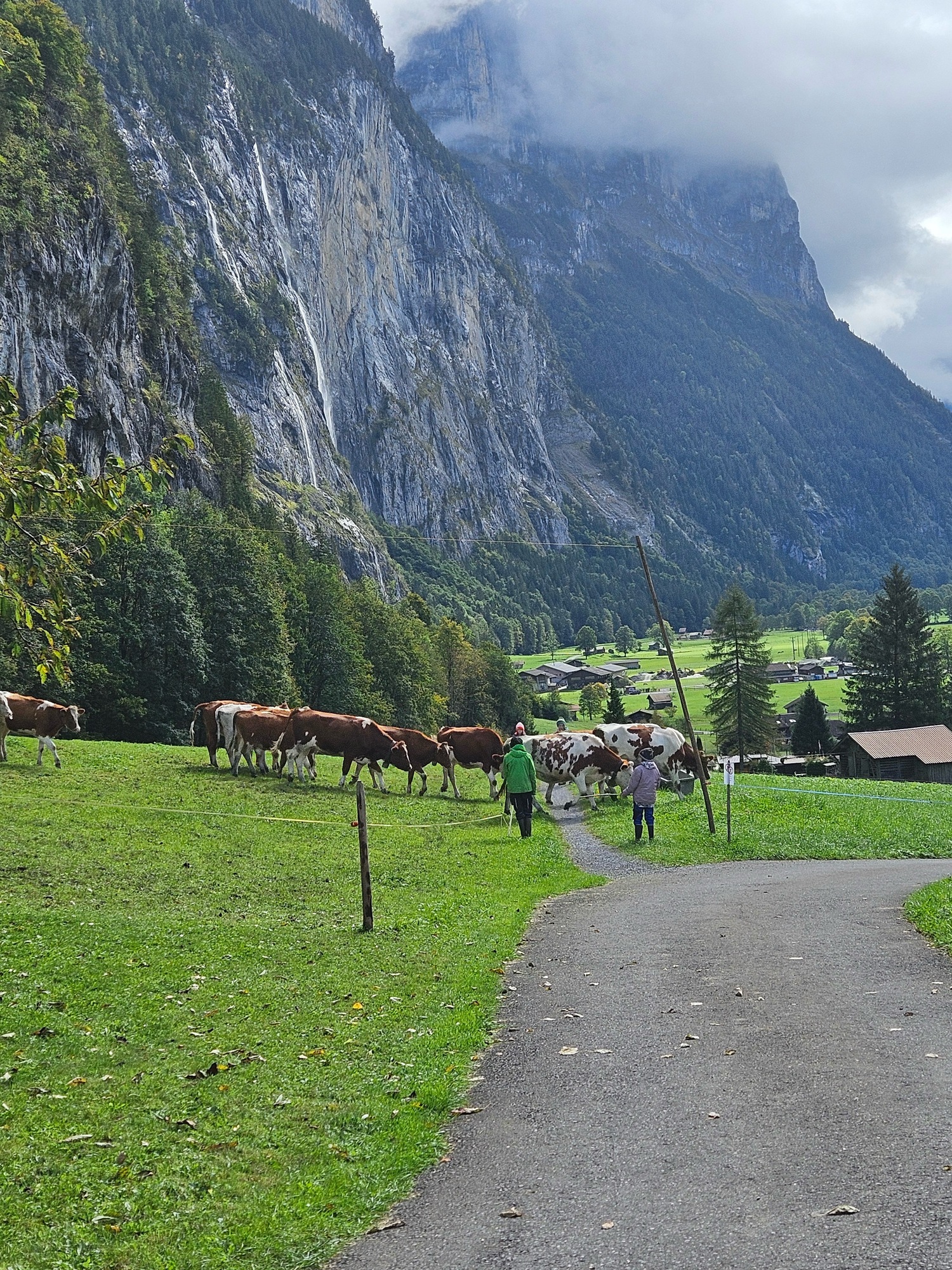 We thoroughly enjoyed the mostly flat walk, witnessing a herd of cows who welcomed their humans who had come to move them to a new pasture; taking pictures of the mountain train; wandering past a settlement of summer cabins and remote farms. The views were as we hoped including the Staubbach Falls, the train station, the Grütschalp cable car, and the entire village at our feet like a model train layout.