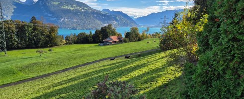 A couple of years ago a local resident of Thun told me about a loop route at Aeschi bei Spiez, above the lake town of Spiez, about an hour from Lauterbrunnen. The Aeschi Bänkli Rundweg takes in the cow-studded meadows above Spiez, distant peaks, and stunning views of Lake Thun. At 4+ miles it seemed doable — and we did it — but has some downsides that have us hesitant to recommend it. One half is largely paved roads where you can walk abreast. The other half is not paved and consists in part of faint paths across grass and some other very narrow paths. We had to do a bit of way-finding to decipher the best route and made a couple of misjudgments. Can’t have that in a book so we’d have to re-walk the route to get a good fix on foolproof directions.