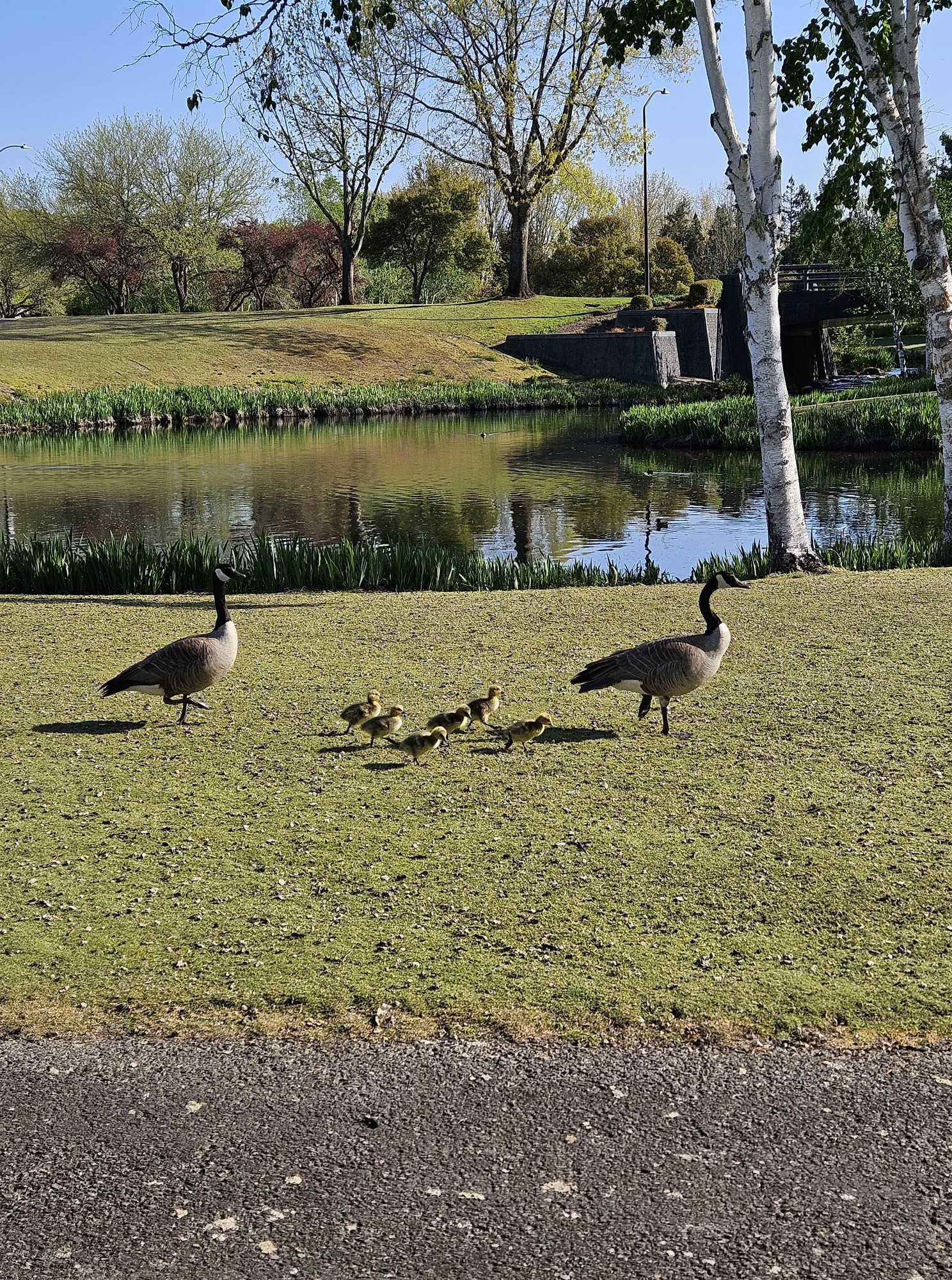 It is mid-spring in the Willamette Valley and the surest sign to me that summer approaches is the appearance of baby waterfowl. We spotted the first ducklings last Monday (could they even have been 24 hours old?) at Fernhill Wetlands and at least three families of geese delighted our walk on Wednesday at Dawson Creek. Makes me smile every time and we take photos of them paddling after dad with mom as rear guard.